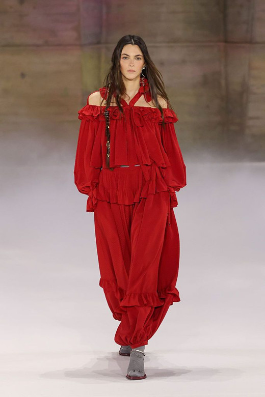 Koleksiyon, Chloé’nin simgesi olan bohem ruh ile maskülen formların birleşmesinden doğuyor. Dik yakalı koyu mavi paltolar, karakteristik balon kollar ve bilekte toplanan pileli pantolonlar başrolde yer alırken; bu yapısal parçalar uçuşan "çayır" (prairie) elbiseleri ve ince çiçek nakışlarıyla dengeleniyor.